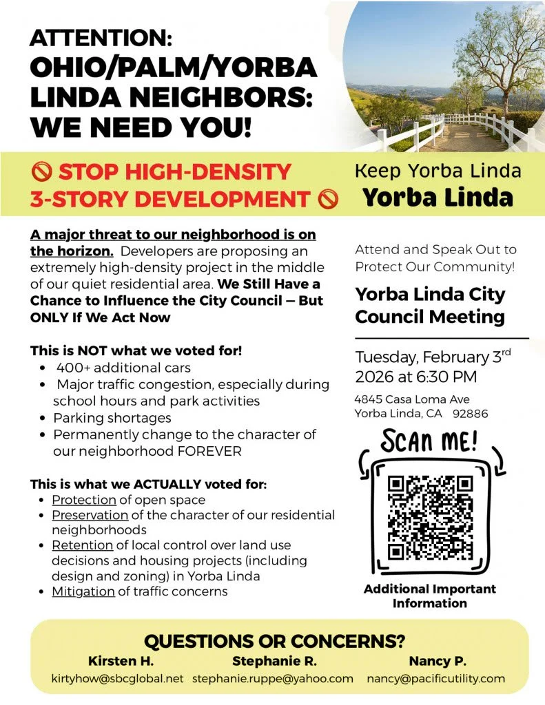 Yorba Lindans for Local Control (YL4LC) is a city-wide resident group dedicated to providing clear information about the upcoming housing measures to help you make informed decisions. We are your neighbors and we believe in: